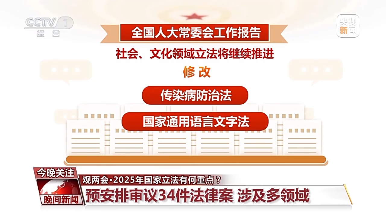 社會、文化領域立法將繼續推進,2025年將制定法治宣傳教育法、社會救助法、托育服務法檢察公益訴訟法,修改傳染病防治法和國家通用語言文字法。
