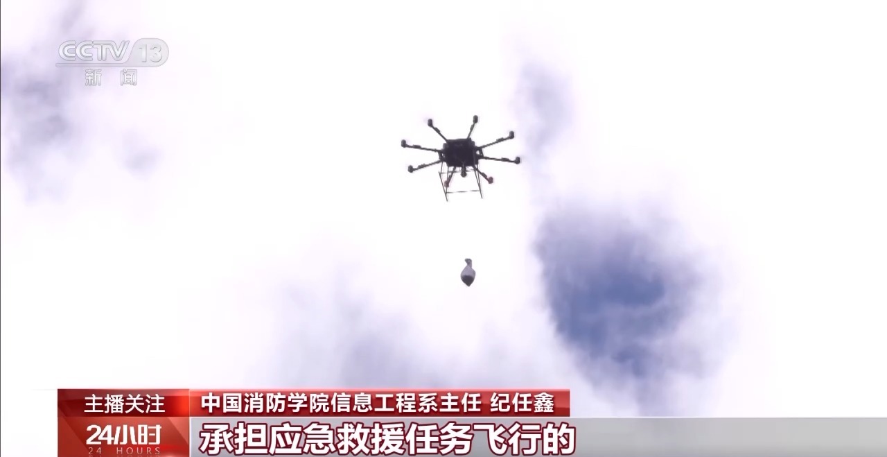 *中國消防學院信息工程系主任紀任鑫:*通過搭載不同的任務裝置,無人機可以開展災情的偵察、航測的勘察通信的蹤跡以及喊話照明、物資投送等輔助救援作用,可以説貫穿於應急救援全過程全要素,涵蓋災情偵察、輔助決策、應急處置、救援保障對應急救援提供了重要的一個支撐。