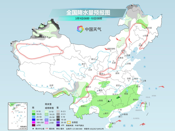 後天,新疆北疆北部和南疆高海拔山區、西藏北部和東部、青海南部、川西高原北部、內蒙古東部、黑龍江西部和北部等地部分地區有小到中雪或雨夾雪,其中,新疆阿勒泰山區、內蒙古東北部、黑龍江西部等地部分地區有大到暴雪(10~15毫米)。內蒙古東南部、東北地區中南部、西南地區東部、江漢、江淮大部、江南北部和西部、華南西部等地部分地區有小到中雨,其中,重慶東南部、湖南西北部、湖北東南部等地局地有大雨或暴雨。