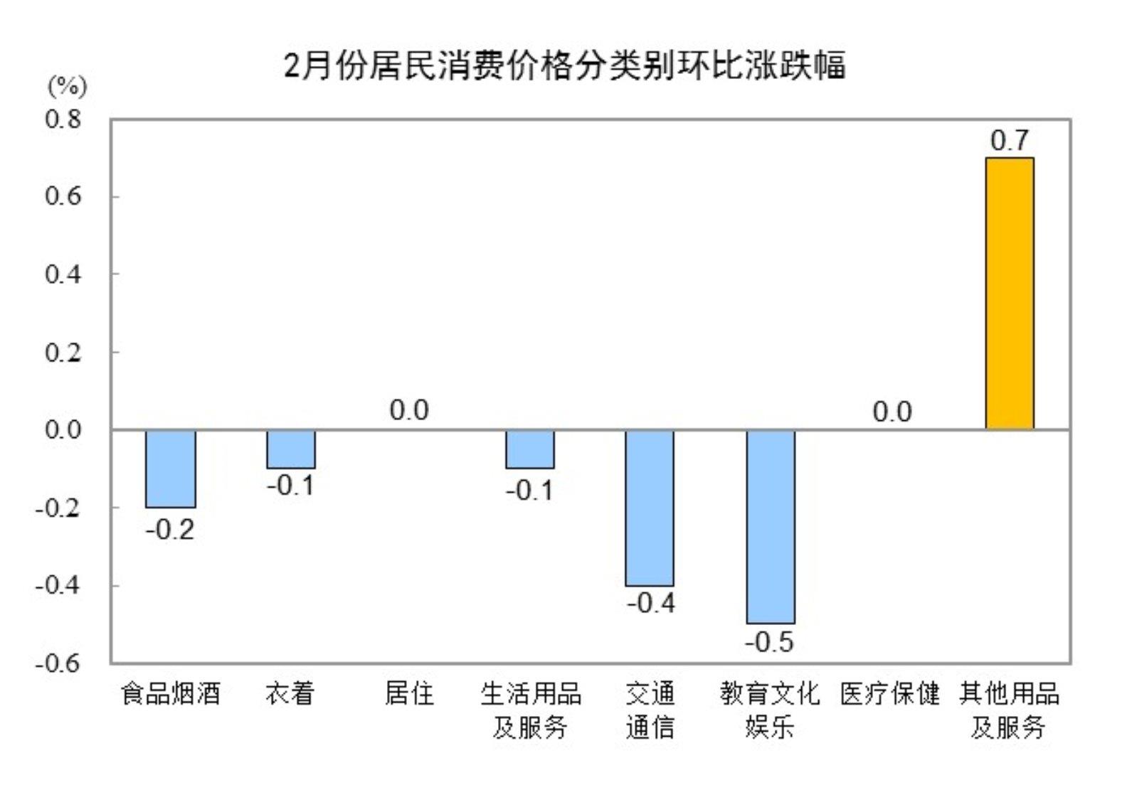 2月份,全國居民消費價格環比下降0.2%。其中,城市下降0.2%,農村下降0.1%;食品價格下降0.5%,非食品價格下降0.1%;消費品價格持平,服務價格下降0.5%。