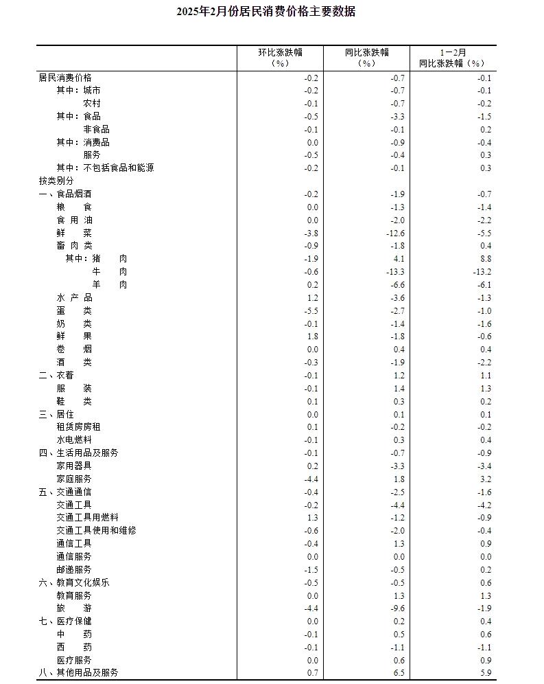 2025年2月份,全國居民消費價格同比下降0.7%。其中,城市下降0.7%,農村下降0.7%;食品價格下降3.3%,非食品價格下降0.1%;消費品價格下降0.9%,服務價格下降0.4%。1—2月平均,全國居民消費價格比上年同期下降0.1%。