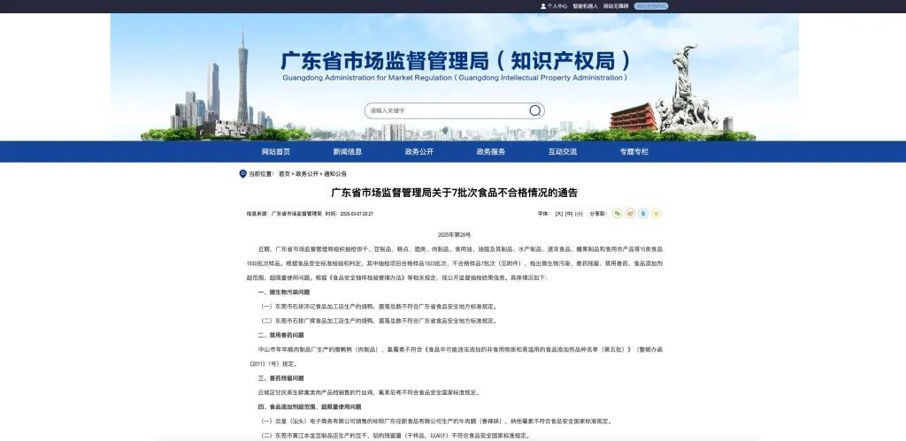 3月7日,廣東省市場監督管理局發佈一則關於7批次食品不合格情況的通告。通告稱,近期,廣東省市場監督管理局組織抽檢餅乾、豆製品、糕點、酒類、肉製品、食用油、油脂及其製品、水產製品、速凍食品、糖果製品和食用農產品等10類食品1930批次樣品。根據食品安全標準檢驗和判定,其中抽檢項目合格樣品1923批次、不合格樣品7批次,檢出微生物污染、獸藥殘留、禁用獸藥、食品添加劑超範圍、超限量使用等問題。 本次監督抽檢具體情況如下: