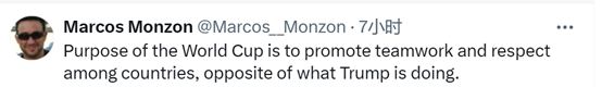還有人説,“世界盃的目的是促進國家之間團隊合作與尊重,這與特朗普的做法相反。”