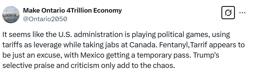“美國政府似乎在玩政治遊戲,以關税為籌碼,對加拿大進行打擊。芬太尼關税似乎只是藉口,墨西哥暫時獲得豁免。特朗普的選擇性讚揚和批評只會加劇混亂。”