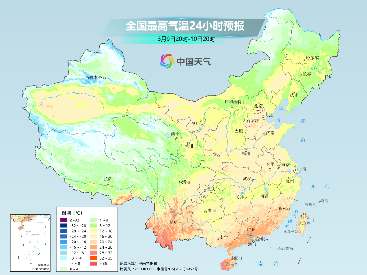 南方也將開啓升温模式,並在11日至12日達到氣温高點,西南地區東部到江南等地最高氣温將升至20℃以上,最高氣温20℃線將向北推進到河北南部,回暖之強勢,可見一斑。