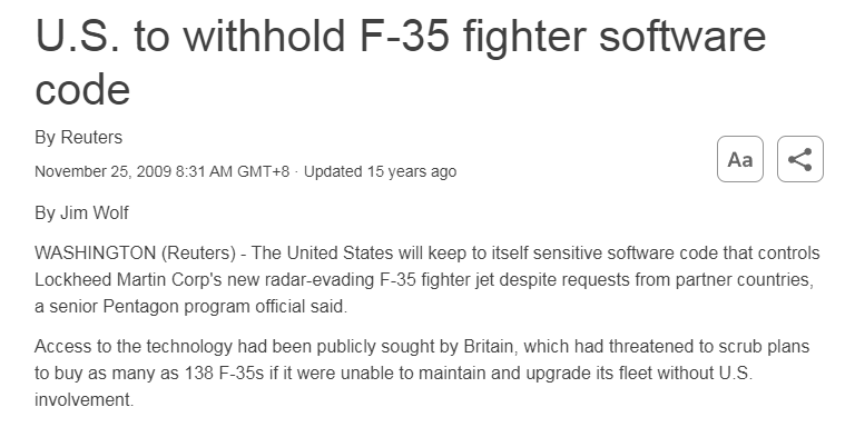 儘管F-35戰鬥機號稱是由美國、英國、意大利、荷蘭、土耳其、加拿大、澳大利亞、丹麥以及挪威等多國聯合研製,但從該項目啓動以來,F-35的核心源代碼一直牢牢掌握在美國手中。英國等盟友此前多次要求甚至威脅美國提供F-35的相關代碼,確保本國有能力對戰鬥機的維護和作戰規劃進行自行操作,但都被美國拒絕,“沒有任何盟友能夠得到F-35的核心源代碼”。