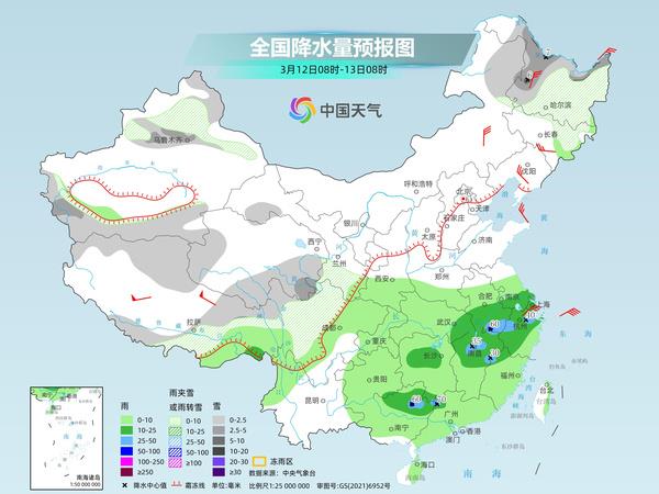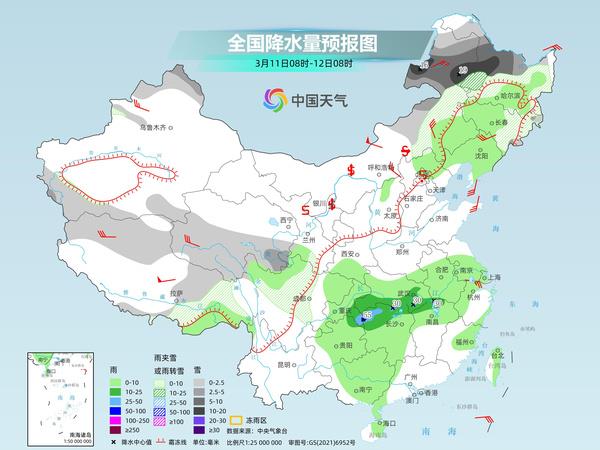 後天,新疆北疆、內蒙古東北部、東北地區北部、西藏北部和南部、西北地區中部和東南部、川西高原北部等地部分地區有小到中雪或雨夾雪,局地有大雪。江漢東部、江淮、江南中東部、華南北部等地部分地區有中到大雨,局地有暴雨。
