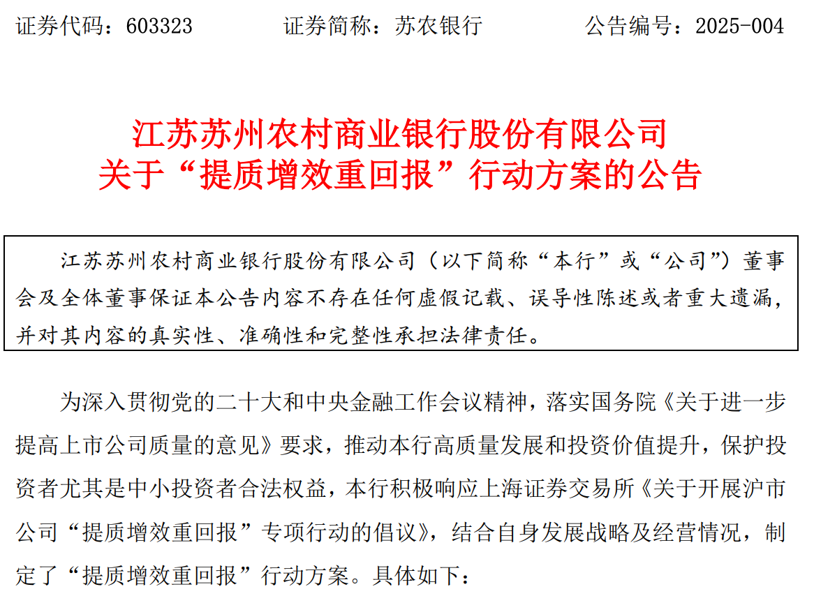 比如,蘇農銀行在3月8日發佈行動方案表示,強化市值管理,重視投資者回報。以提升公司內在價值為核心,提升信息披露透明度,完善投資者溝通機制,重視股東投資回報。