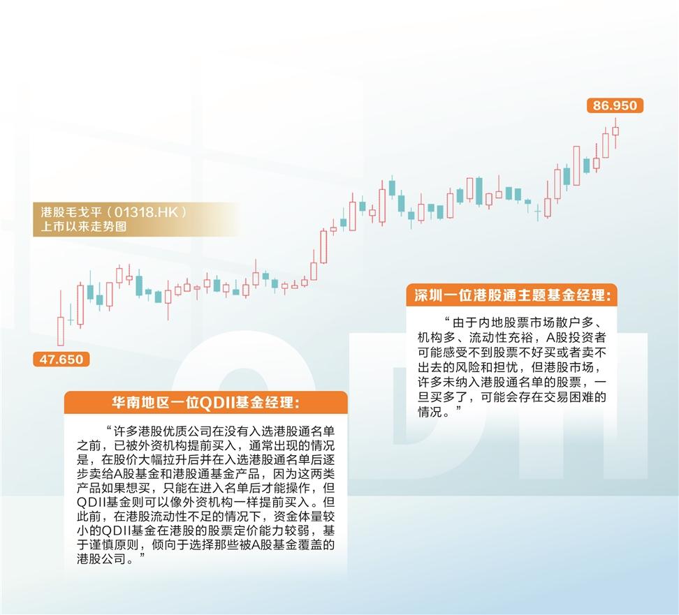 以3月10日正式生效納入港股通名單的化妝品股票毛戈平為例,該股在去年四季度尚未納入港股通名單範圍時,已有匯添富基金、南方基金、富國基金等公募旗下QDII基金重倉該股。由於該股在3月10日才正式納入,這意味着,在正式納入港股通之前,沒有相關A股資金的助力,QDII基金買入這類股票,在資金層面有點“孤軍奮戰”。