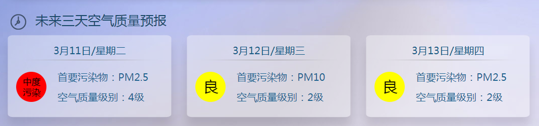 需要注意的是,今明兩天本市擴散條件和能見度較差,目前全市空氣質量處於輕度污染水平 ,請注意健康防護和交通安全。
