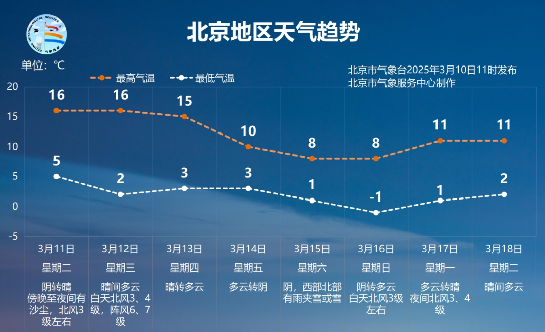 受上述兩股冷空氣的影響,本週氣温逐漸下滑,週末最高氣温降至8℃上下。 預計3月11日至3月18日,白天最高氣温8℃至16℃,夜間最低氣温-1℃至5℃。