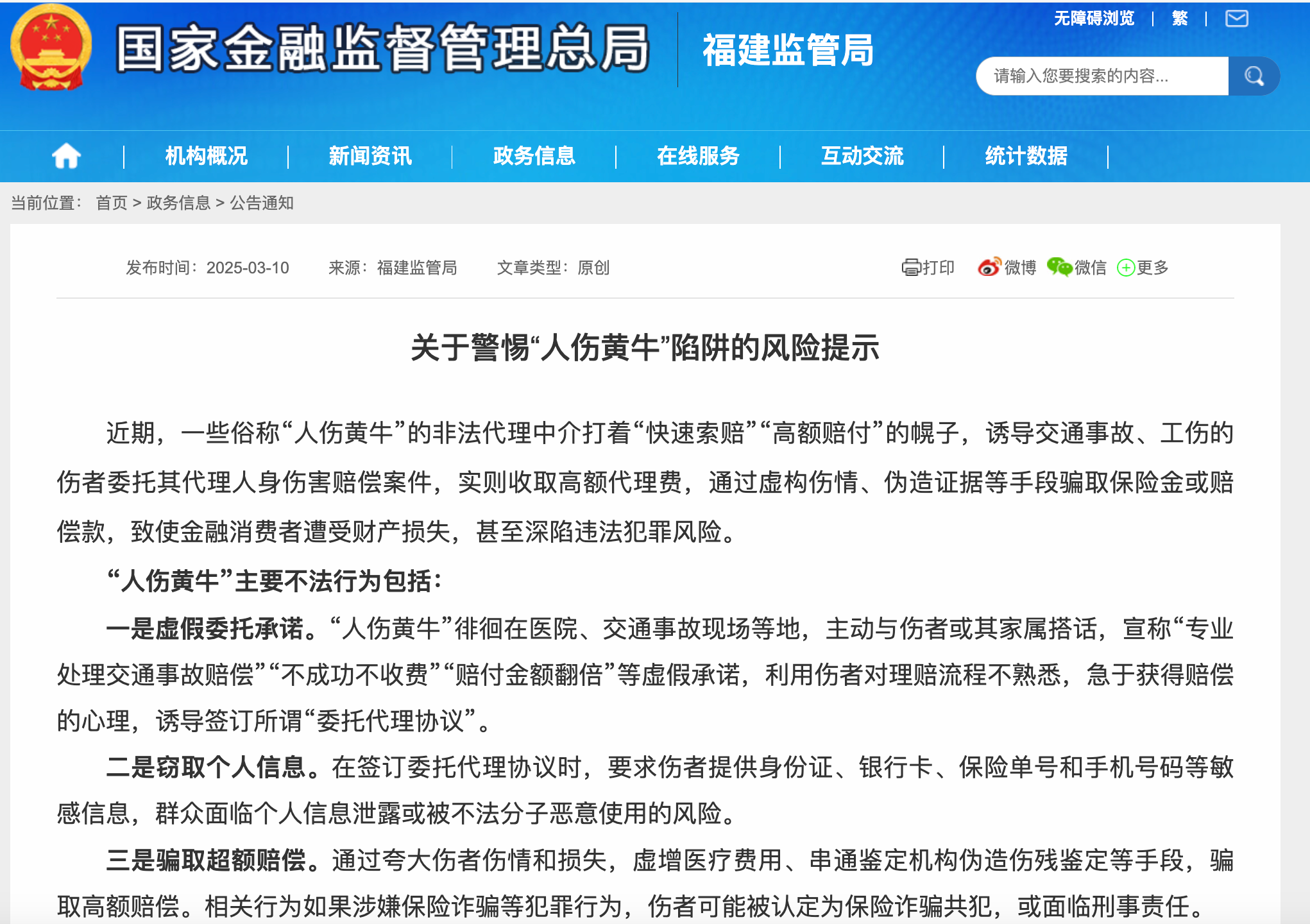 【環球網金融綜合報道】3月10日,國家金融監督管理總局福建監管局發佈關於警惕“人傷黃牛”陷阱的風險提示。文章稱,近期,一些俗稱“人傷黃牛”的非法代理中介打着“快速索賠”“高額賠付”的幌子,誘導交通事故、工傷的傷者委託其代理人身傷害賠償案件,實則收取高額代理費,通過虛構傷情、偽造證據等手段騙取保險金或賠償款,致使金融消費者遭受財產損失,甚至深陷違法犯罪風險。