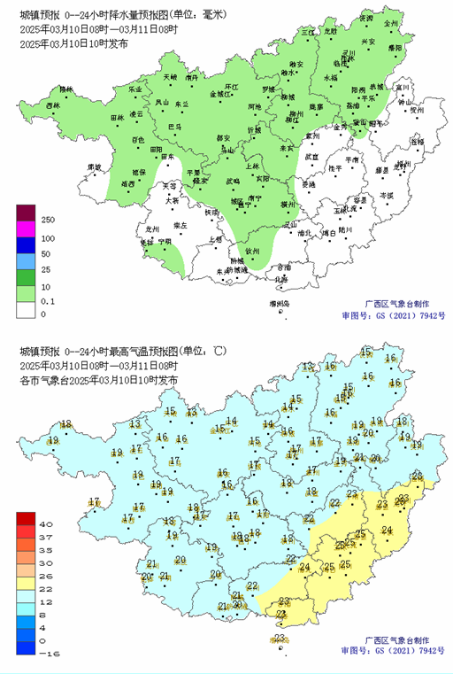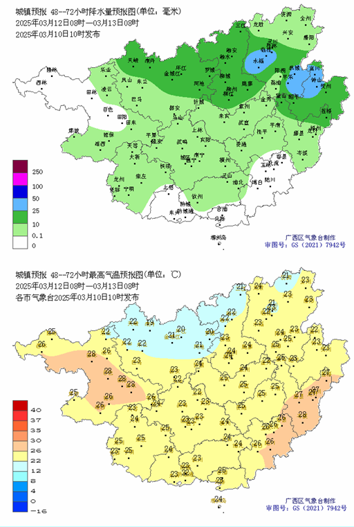 根據中央氣象台發佈的最新具體預報,3月10日,桂林大部陰轉小雨,氣温10℃~16℃。3月11日,桂林大部小雨,氣温會有明顯上升,白天最高氣温21℃,夜晚14℃。3月12日,桂林大部中雨轉大雨,氣温14℃~20℃。3月13日,桂林大部中雨轉暴雨,氣温12℃~18℃。