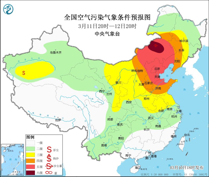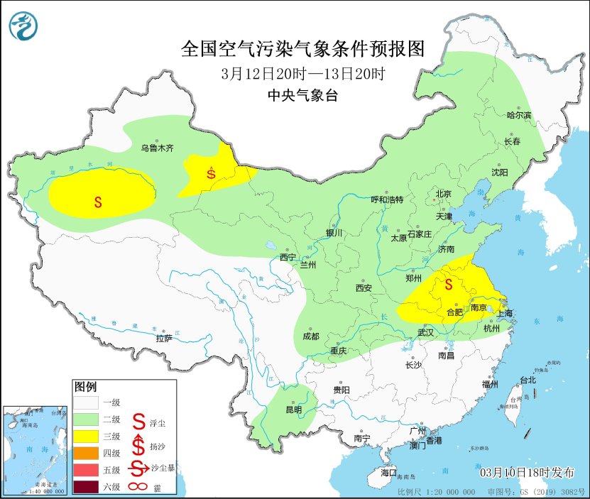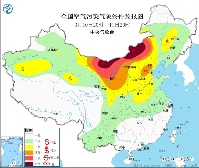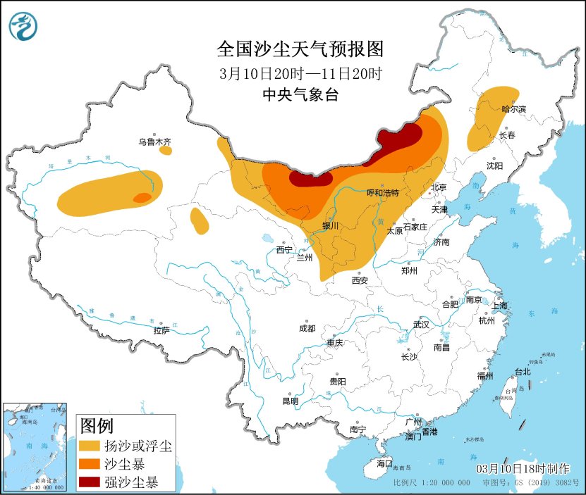 10日夜間至12日,西北地區中東部、內蒙古中西部、華北大部、黃淮等地自西向東將有一次沙塵天氣過程,其中新疆東部、內蒙古中西部、甘肅西部等地的部分地區有沙塵暴或強沙塵暴。中央氣象台3月10日18時繼續發佈沙塵暴藍色預警,預計,3月10日20時至11日20時,新疆東部和南部、內蒙古中西部、甘肅西部和東南部、寧夏、青海西北部、陝西中北部、山西北部、河北北部、北京西部、吉林西部、黑龍江西南部等地有揚沙或浮塵天氣,其中新疆東南部、內蒙古中西部、甘肅西部等地的部分地區有沙塵暴,局地有強沙塵暴。