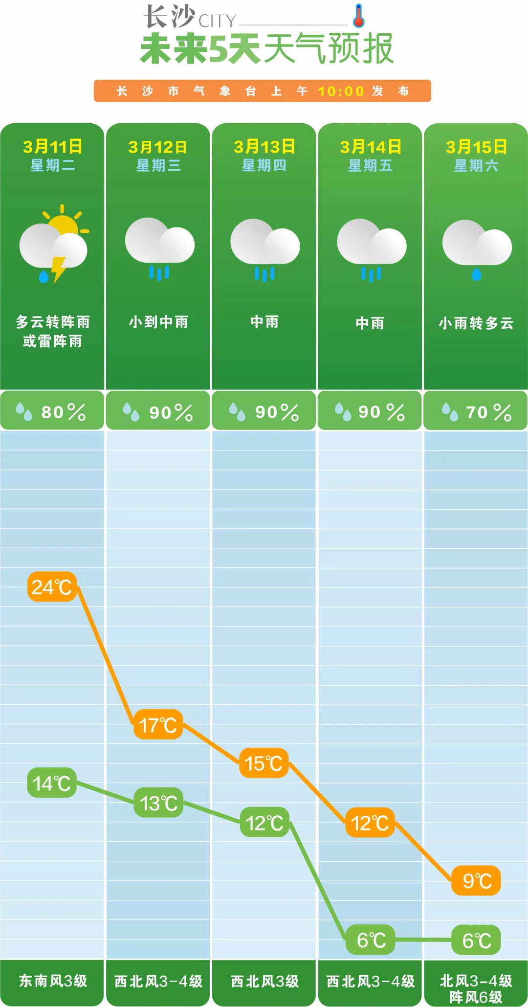 根據氣象部門預報,11日晚至15日白天有次降温、降雨過程,並伴有雷暴大風等強對流天氣,過程累計雨量湘西州南部、懷化中部、永州南部局地110~140毫米,湘中偏北、湘南的其他地區50~80毫米。其中,11日湘西州中南部、懷化北部有暴雨;12日湘中、湘東南局地大到暴雨;13日湘中、湘南局地大雨;14日湘南局地暴雨。