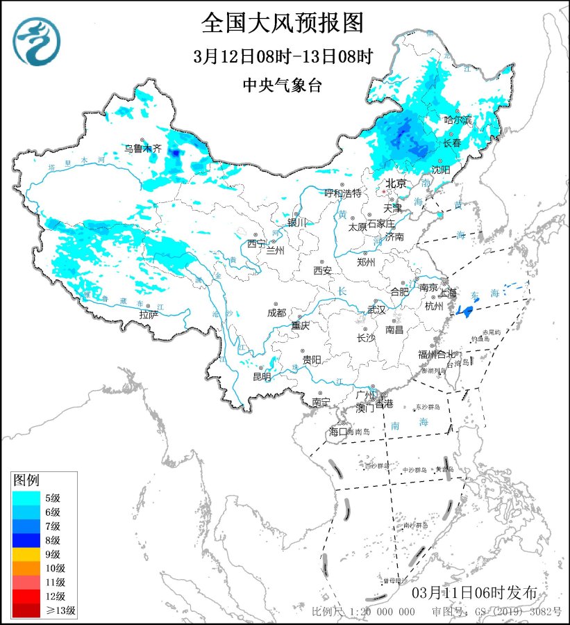 3月12日08時至13日08時,新疆東部、內蒙古中東部、東北地區中西部和南部、華北東北部、西藏中西部等地有5~6級風,其中,新疆東部山口地區、內蒙古東部等地的部分地區有7~8級風,局地陣風可達9級及以上;東海西部部分海域將有7級、陣風8級的大風。