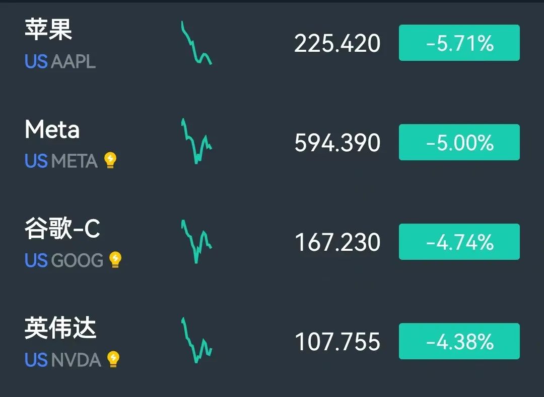 其他美國科技股龍頭也集體暴跌,無一倖免。其中,蘋果跌超5.71%,Meta下跌5%,谷歌下跌4.74%;英偉達下跌4.34%,觸及6個月以來低點。
