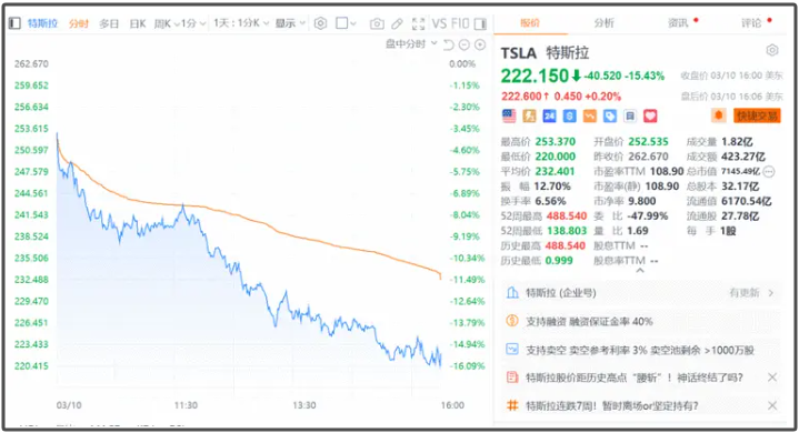 此外,特斯拉跌超15%,為2020年9月以來最大單日跌幅,市值一夜蒸發1303億美元(約合人民幣9459億元),當前股價較歷史高點已遭“腰斬”。