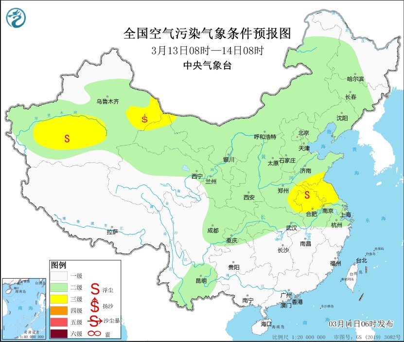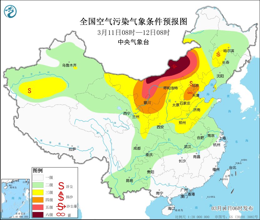 預計,3月11日08時至12日08時,新疆南部、內蒙古中西部、甘肅東部、寧夏、陝西中北部、山西、河北、北京、天津、河南北部、山東北部、遼寧西部、吉林西部等地有揚沙或浮塵天氣,其中內蒙古中西部的部分地區有沙塵暴,局地有強沙塵暴。中央氣象台3月11日06時發佈沙塵暴黃色預警。