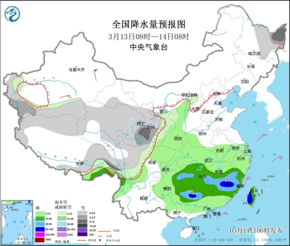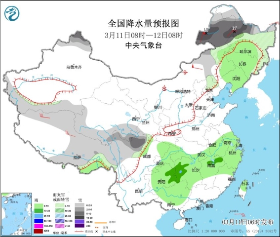雨雪方面,今明兩天,內蒙古東北部、東北地區中北部及新疆北部、西藏北部和東部、青海南部、川西高原等地的部分地區有小到中雪或雨夾雪,新疆北部、內蒙古東北部、黑龍江西部等地的部分地區有大到暴雪,局地大暴雪。明天起至15日,江南、華南、貴州東部、江漢東部及江淮等地將有中到大雨,部分地區有暴雨,上述地區局地並伴有短時強降水、雷暴大風等強對流天氣。