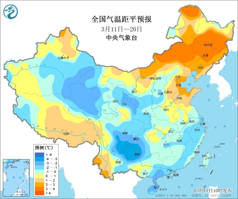 未來10天,內蒙古中部和東部、東北地區大部等地平均氣温較常年同期偏高1~3℃,西南地區東部、華南南部、江南東部、西北地區中部和東部等地偏低1~3℃;全國其餘大部分地區基本接近常年。