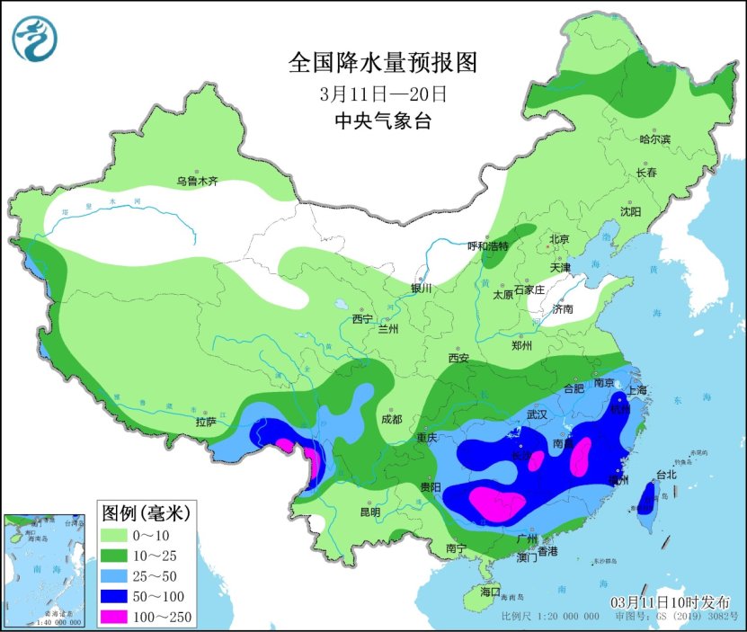 未來10天(3月11-20日),江淮南部、江南、華南中北部及貴州東部、雲南西北部等地累計降水量有30~60毫米,其中江南中部和南部、華南北部等地的部分地區有70~90毫米,局地可達130~170毫米;新疆北部、西北地區東部、黃淮西部、華北北部、內蒙古中部和東部、東北地區大部、青藏高原東部和北部等地累計降水量有2~7毫米,部分地區13~20毫米;上述大部地區累計降水量較常年同期偏多。