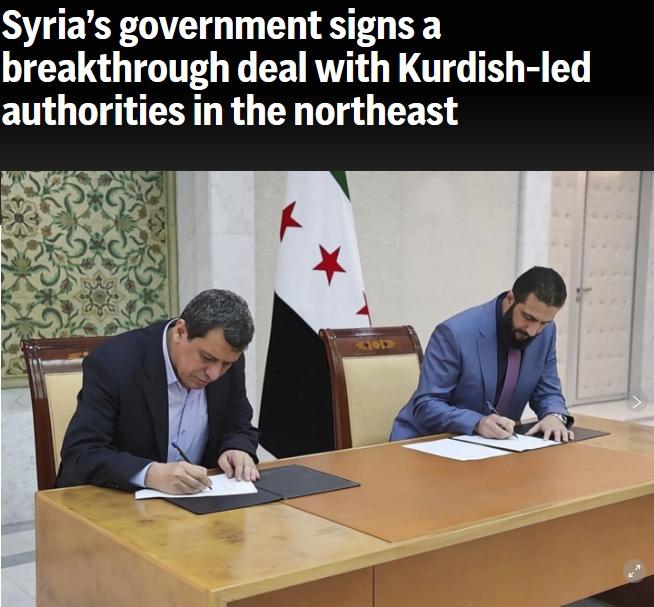 同日,敍利亞總統府宣佈,敍過渡政府和敍庫爾德武裝主導的“敍利亞民主力量”領導人當天簽署協議,同意將“敍利亞民主力量”整合進國家機構。