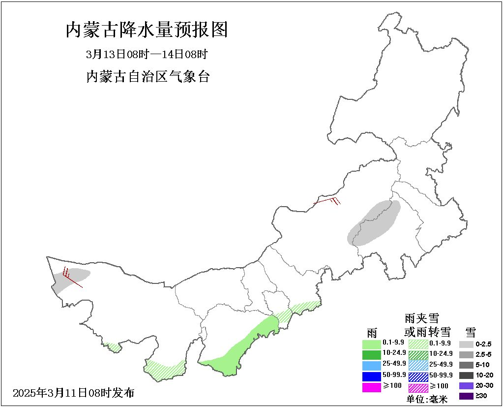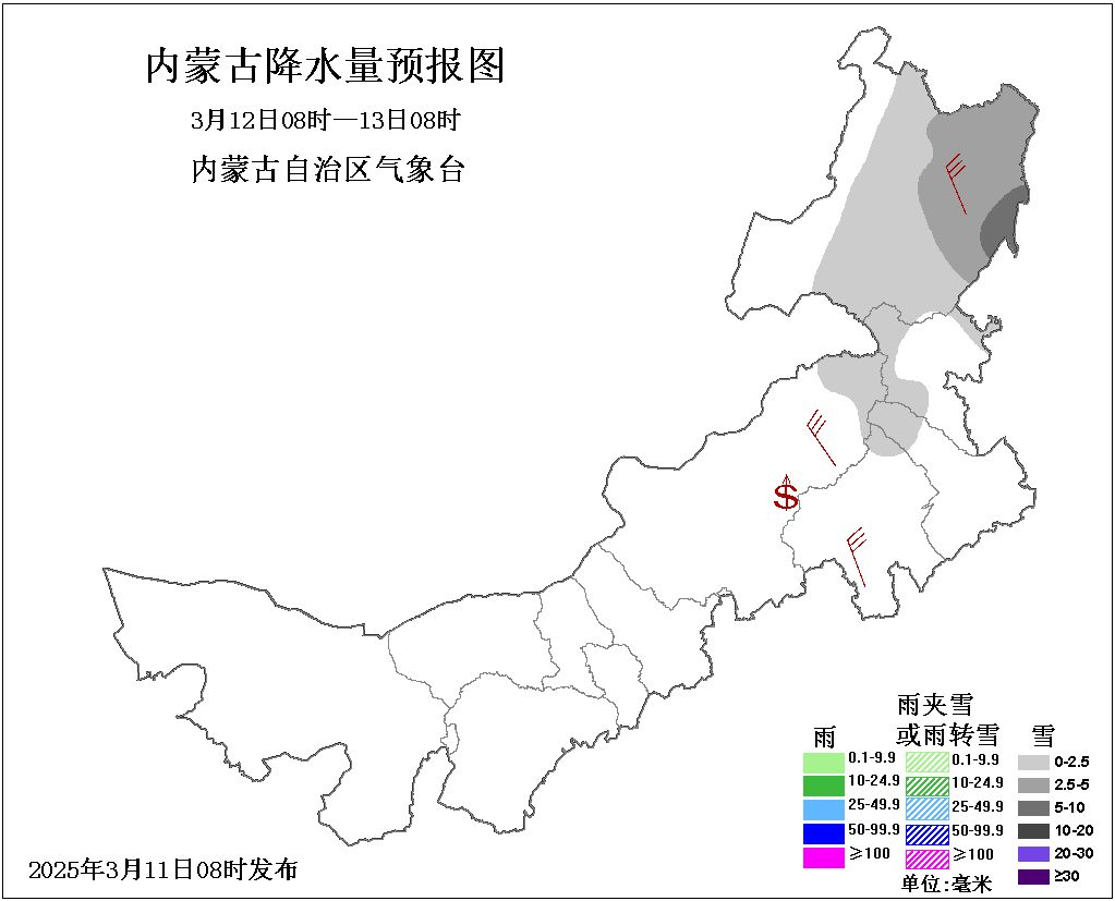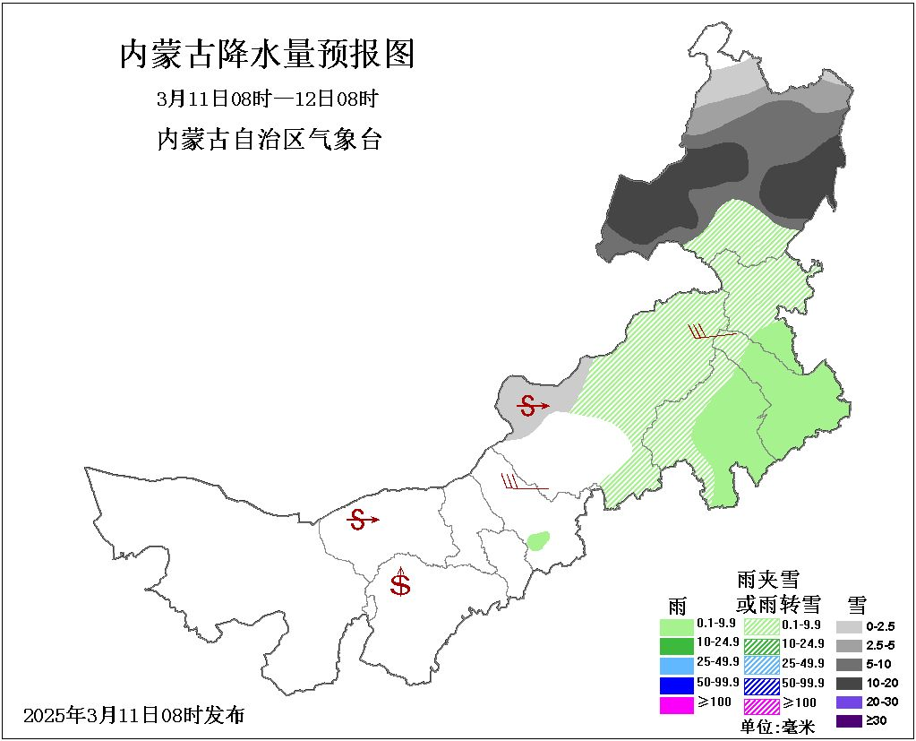 預計今天(3月11日),內蒙古中部偏東及東部大部地區有雨雪天氣,呼倫貝爾市中部和南部有中到大雪,局地有暴雪。全區大部風沙肆虐,有短時7、8級局地9、10級大風,中西部大部及東南部有沙塵天氣,局地有沙塵暴或強沙塵暴。中西部及東南部地區降温4~8℃,局地降温8℃以上,各主要城市最高氣温在8~14℃之間。明天,東北部降雪持續,中部偏東和東南部風力強勁,局地陣風可達8、9級或以上,同時伴有揚沙或浮塵天氣,局地沙塵暴,中東部氣温下降4~8℃。今年首輪大規模沙塵天氣來訪,沙塵天氣下請注意做好健康防護!