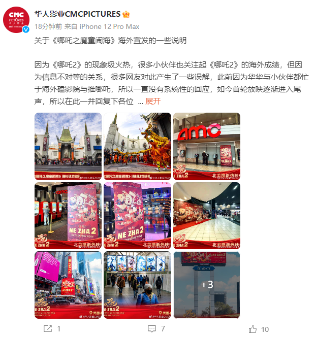 3月11日,@華人影業CMCPICTURES 發佈關於《@哪吒之魔童鬧海》海外宣發的一些説明:
