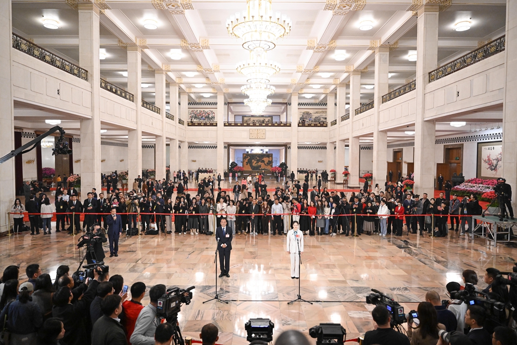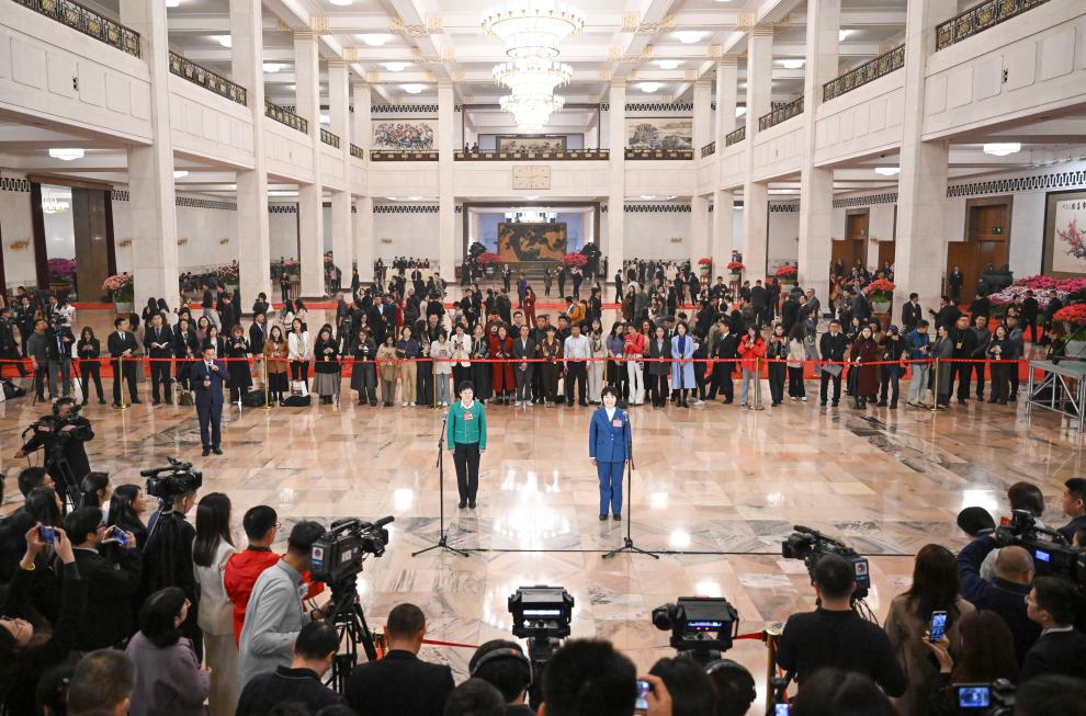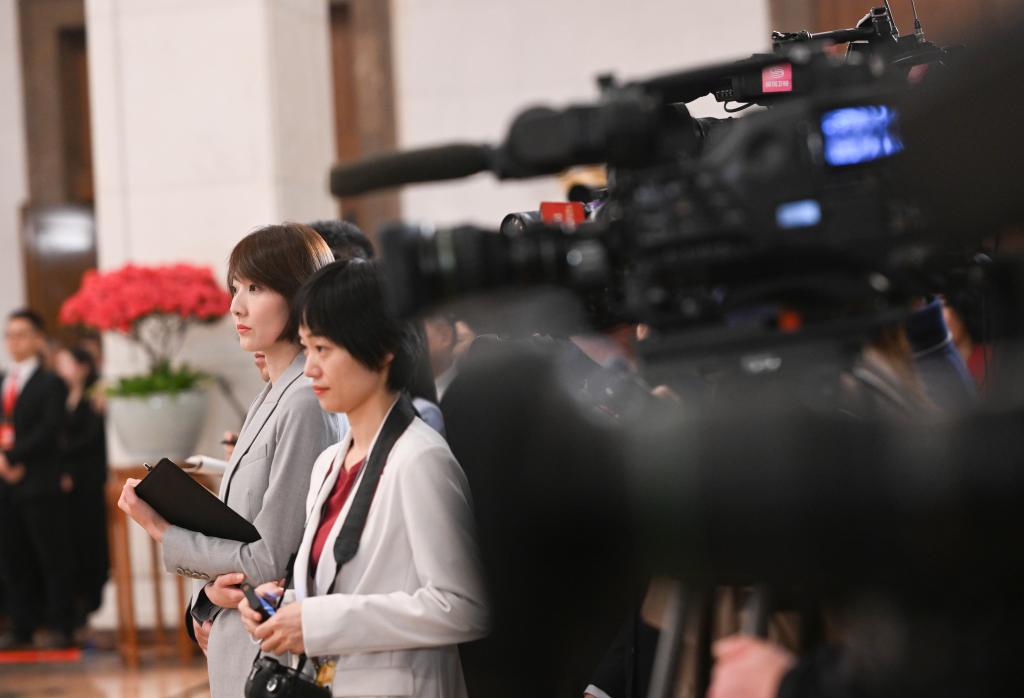 3月11日,第十四屆全國人民代表大會第三次會議第三場“代表通道”集中採訪活動在北京人民大會堂舉行。這是記者在現場採訪。