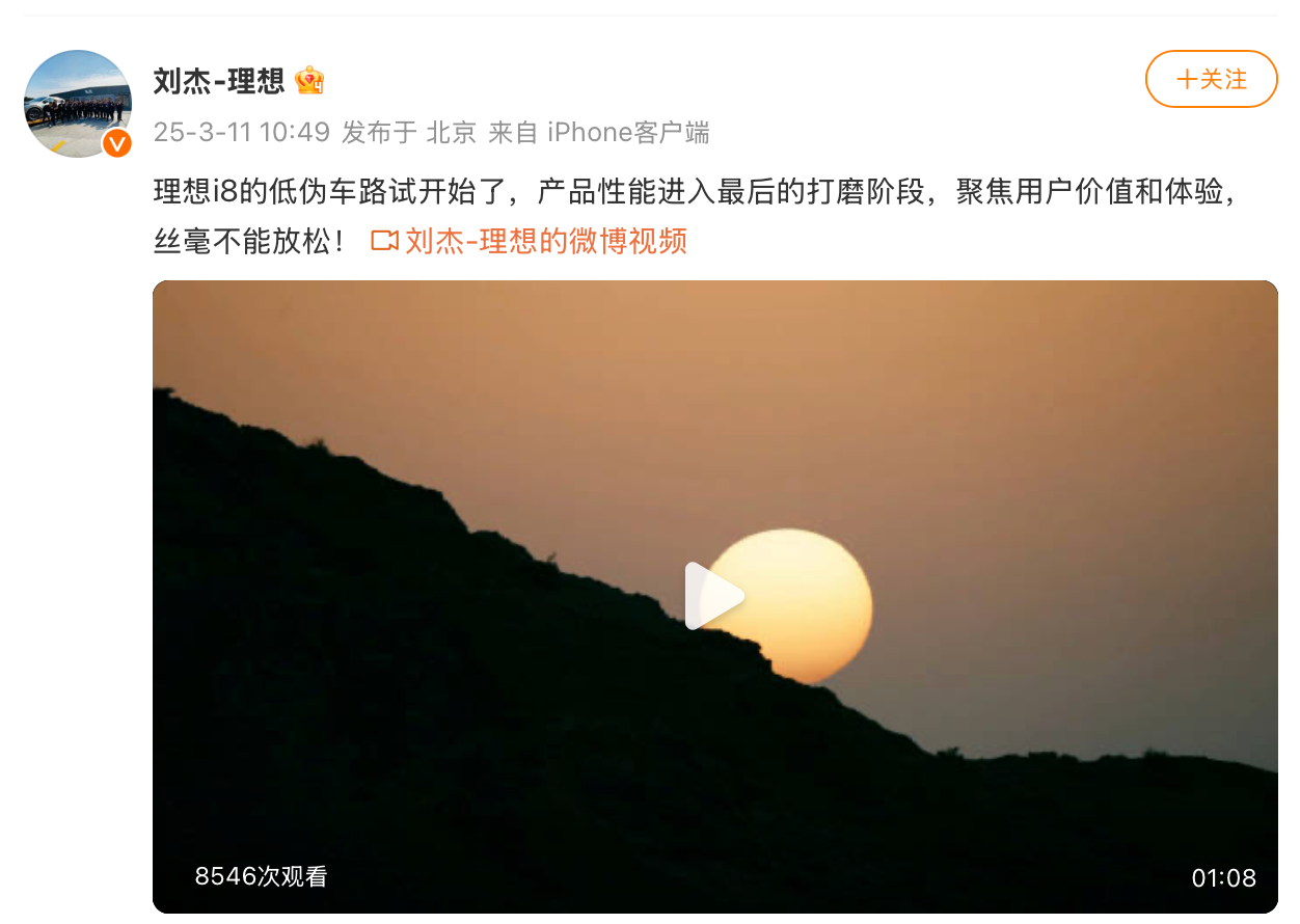 【環球網科技綜合報道】3月11日消息,理想汽車副總裁劉傑今日在社交平台發文稱,理想汽車的首款純電SUV——理想i8的低偽車路試已經開始,產品性能進入了最後的打磨階段。