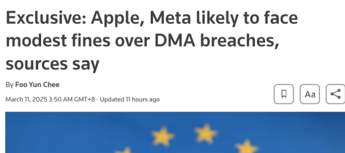 消息人士還提到,罰款適中的其他因素包括涉嫌違規行為的持續時間較短(DMA於2023年5月生效),以及當前的地緣政治環境。