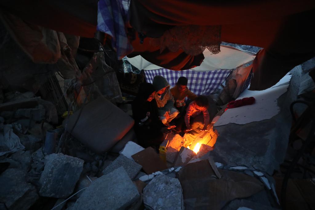 2月18日,在加沙地帶北部城鎮拜特拉希亞,人們在廢墟間用篝火取暖。新華社發(馬哈茂德·扎基攝)
