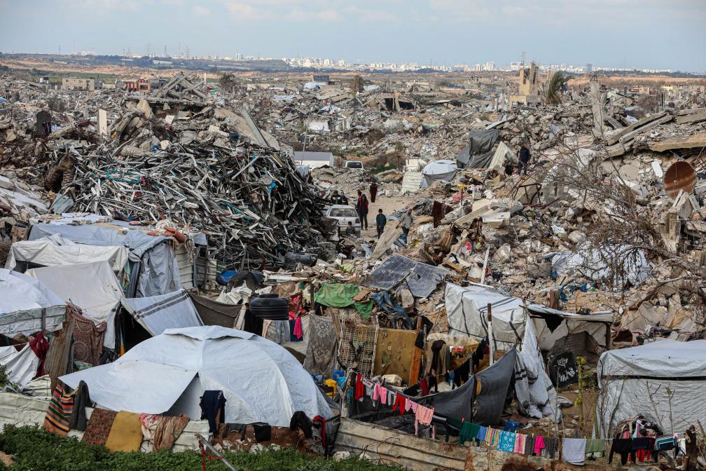 這是2月19日在加沙地帶北部拜特哈嫩拍攝的建築廢墟和臨時帳篷。新華社發(裏澤克·阿卜杜勒賈瓦德攝)