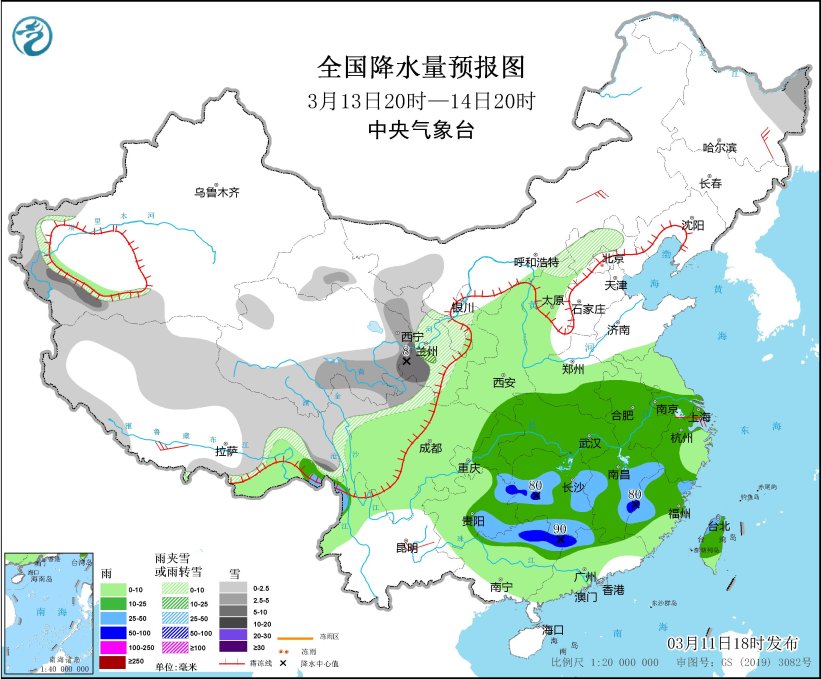*3月13日20時至14日20時,*黑龍江東北部、新疆南疆西部山區、西藏北部和東部、青海南部、甘肅中南部、川西高原北部、華北北部等地部分地區有小到中雪或雨夾雪,其中,青海東部、甘肅西南部、川西高原北部等地部分地區有大雪(5~8毫米)。江淮大部、江漢、江南大部、西南地區東部、華南北部、台灣島大部等地部分地區有中到大雨,其中,湖南南部和西部、江西東部、福建西部、貴州東北部、廣西東北部、廣東西北部等地部分地區有暴雨(50~90毫米)。內蒙古中部、黑龍江東南部、西藏南部、浙江北部等地部分地區有4~5級風(見圖7)。