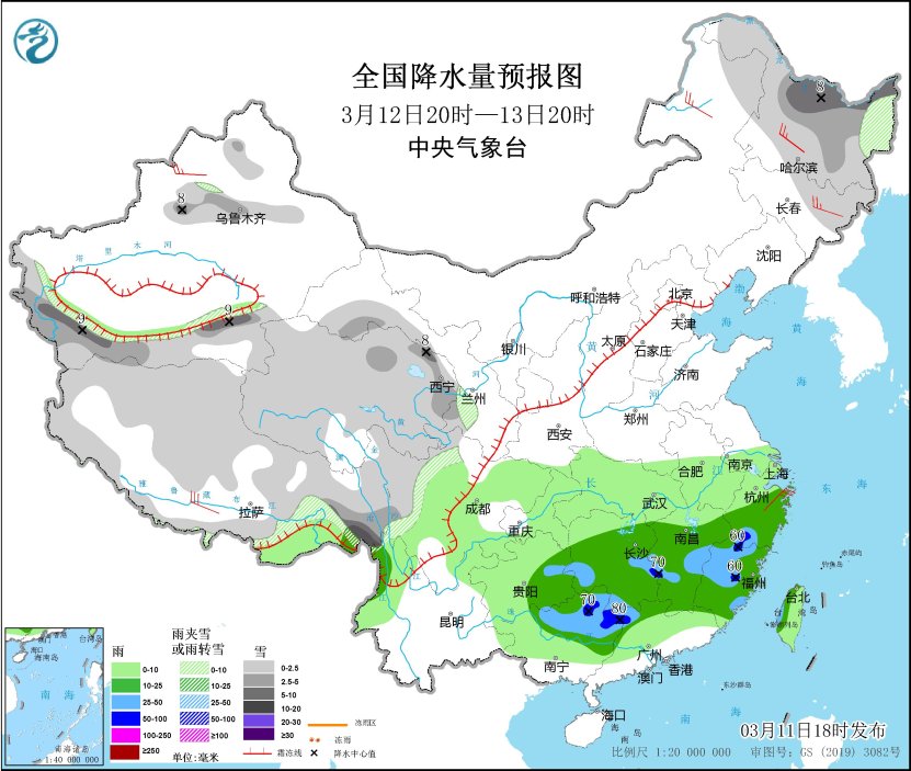 *3月11日20時至12日20時,*內蒙古東部、黑龍江西部和北部、吉林東部、新疆北部和南疆西部山區、西藏東部、青海南部、川西高原中北部、甘肅西南部等地部分地區有小到中雪或雨夾雪,其中,內蒙古東北部、黑龍江北部、川西高原北部等地部分地區有大到暴雪,局地大暴雪(20~25毫米)。東北地區中南部、西北地區東南部、西南地區東部、江淮、江漢、江南、華南中西部、台灣島東部等地部分地區有小到中雨,其中,湖南西部、江西西部和東北部、浙江北部等地部分地區有大雨(25~45毫米)。內蒙古中東部、黑龍江西南部、吉林中西部、遼寧北部、河北北部、新疆東部、西藏北部等地的部分地區有5~7級風(見圖5)。
