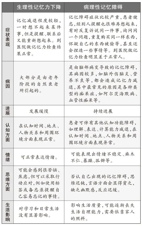 出現健忘症狀可能是生理性記憶力下降,也可能是病理性記憶障礙,大家可根據一個表格簡單辨別。