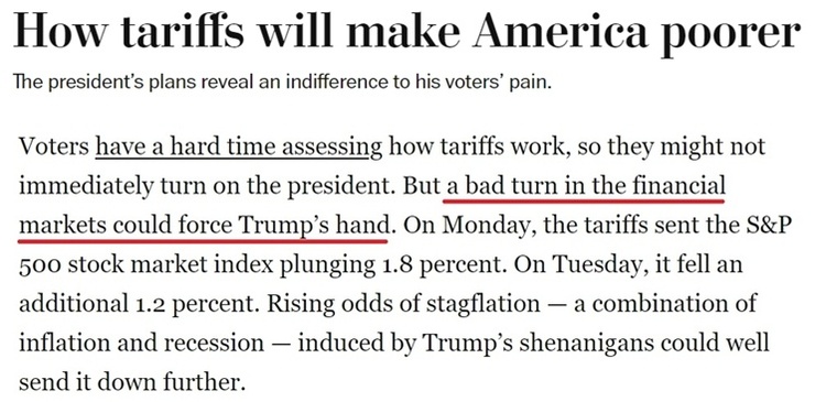 《華盛頓郵報》分析認為,美國選民很難評估關税是如何起作用的,所以他們可能不會立即反對總統。但金融市場發展趨勢的“糟糕轉向”可能會讓特朗普有所醒悟。他的任意而為引發美國經濟陷入滯脹的可能性正在不斷上升,很可能會讓股市進一步下跌。