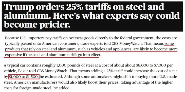 美國經濟與政策研究中心高級經濟學家迪恩·貝克估計,對鋼鋁加徵25%關税可能會使一輛汽車的成本增加1000至1500美元。他特別提到,就算一些汽車製造商可能會轉向購買更多美國製造的鋼鋁,美國製造商也可能會利用進口鋼鐵成本上升的機會提高價格。