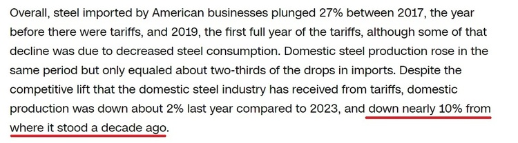 不過諷刺的是,研究顯示,特朗普第一任期內的鋼鋁關税並沒有給美國帶來製造業繁榮。去年美國國內鋼鐵產量較十年前反而減少了近10%,全球競爭力也在下降。