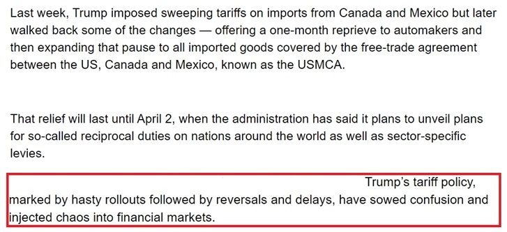 隨後,特朗普又有所回退,決定對美國三大汽車製造商豁免加墨關税一個月,接着又將這一豁免措施擴大到《美加墨協定》(USMCA)覆蓋的所有進口商品,這種豁免將持續到4月2日;