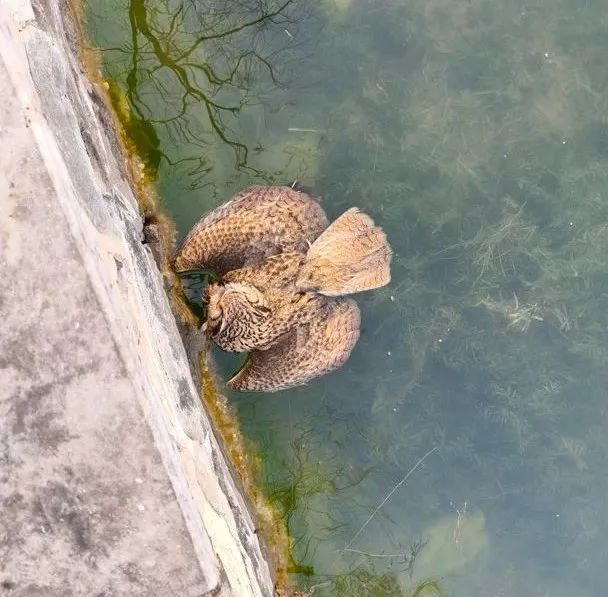 靠近一看,落入水中的是一隻貓頭鷹。開始,陳先生一手扶岸,一手想夠到貓頭鷹,因為距離太遠沒有成功。這時,周圍熱心羣眾提醒他戴上手套防止被鷹爪抓傷,還有人拿來掃帚幫忙。