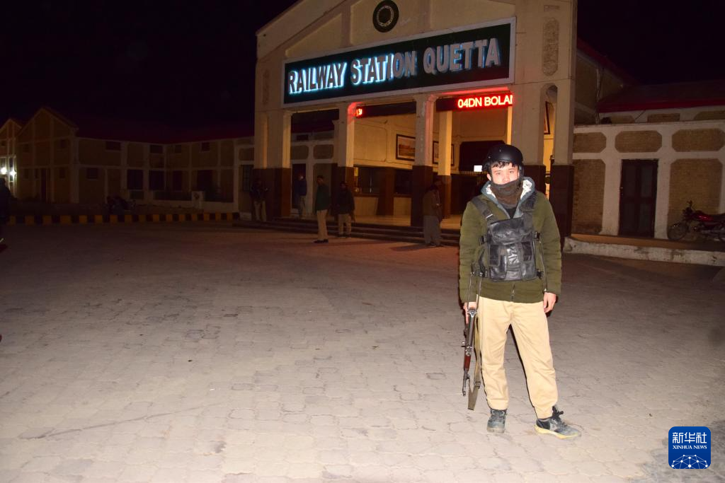 3月11日,在巴基斯坦西南部俾路支省首府奎達,警察在火車站警戒。 新華社發