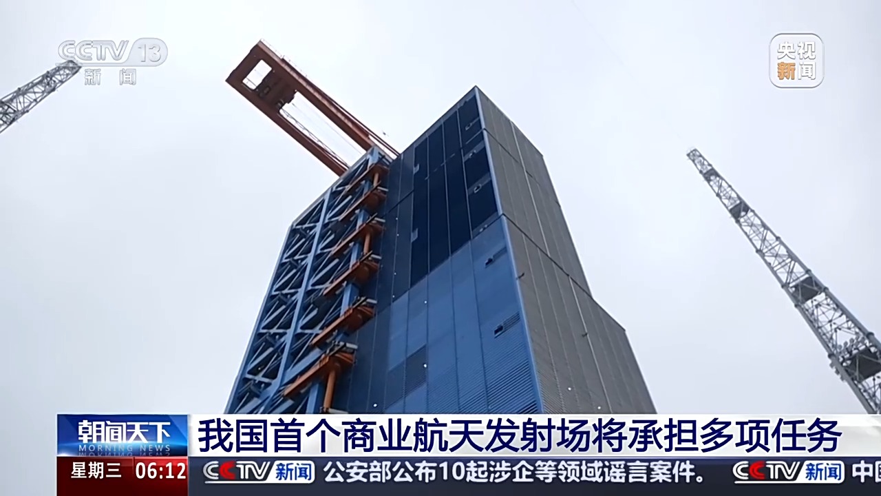 *總枱央視記者 李寧:*這裏是海南文昌,我現在是在距離地面83米的海南商發的一號發射工位,旁邊可以看到它“新三垂”模式的吊車。