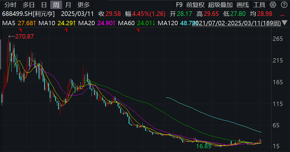 二級市場方面,利元亨股價今年以來表現強勁,截至3月13日年內累計漲幅為32.23%,但目前不足30元的股價,相距該公司2021年8月上市初期創下的270.87元的高位,已累計下跌超80%。