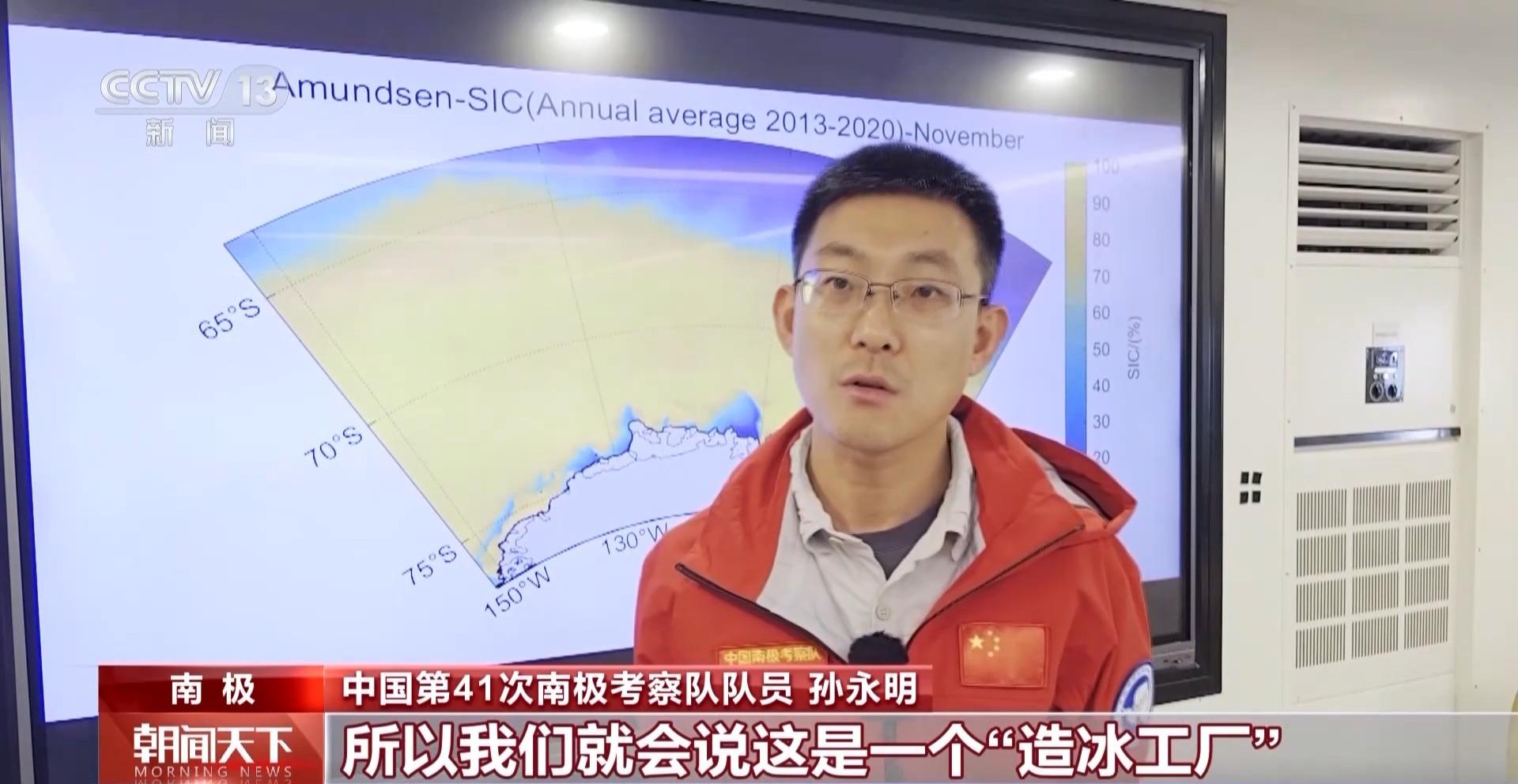 在氣温特別低的時候,南極沿岸其實只有這些冰間湖在產冰,結成了新冰,就會被風吹出去,吹到外圍,這樣的話就會不斷地產生新冰,所以我們就會説這是一個“造冰工廠”。我們通常用一個造冰量來計算冰間湖的規模,阿蒙森海冰間湖是環南極所有冰間湖中,現在是排第四的,是一個比較大的冰間湖。