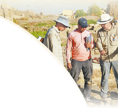 在中埃盧克索孟圖神廟聯合考古項目現場,中埃工作人員探討交流。