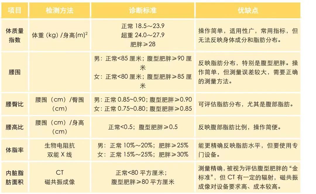 以下表格展示了中國人羣肥胖症的常用診斷標準。