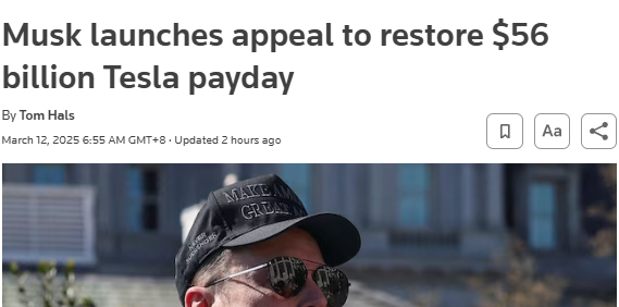 【環球網財經綜合報道】據路透社報道,馬斯克於當地時間週二提起上訴,試圖恢復他從特斯拉獲得的560億美元薪酬,聲稱下級法院法官在撤銷這一創紀錄的薪酬計劃時犯了多項法律錯誤。