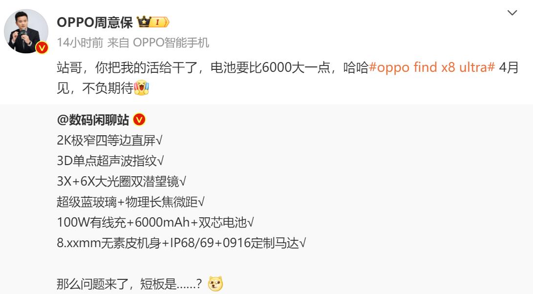 此前,博主@數碼閒聊站 曝光了該機型的部分規格信息,其中提到該手機內置 6000mAh 雙芯電池,支持 100W 有線快充。周意保在轉發相關微博時明確表示,Find X8 Ultra 的電池容量比 6000mAh“大一點”,即超過 6000mAh,並預告該手機將於 4 月與消費者見面。